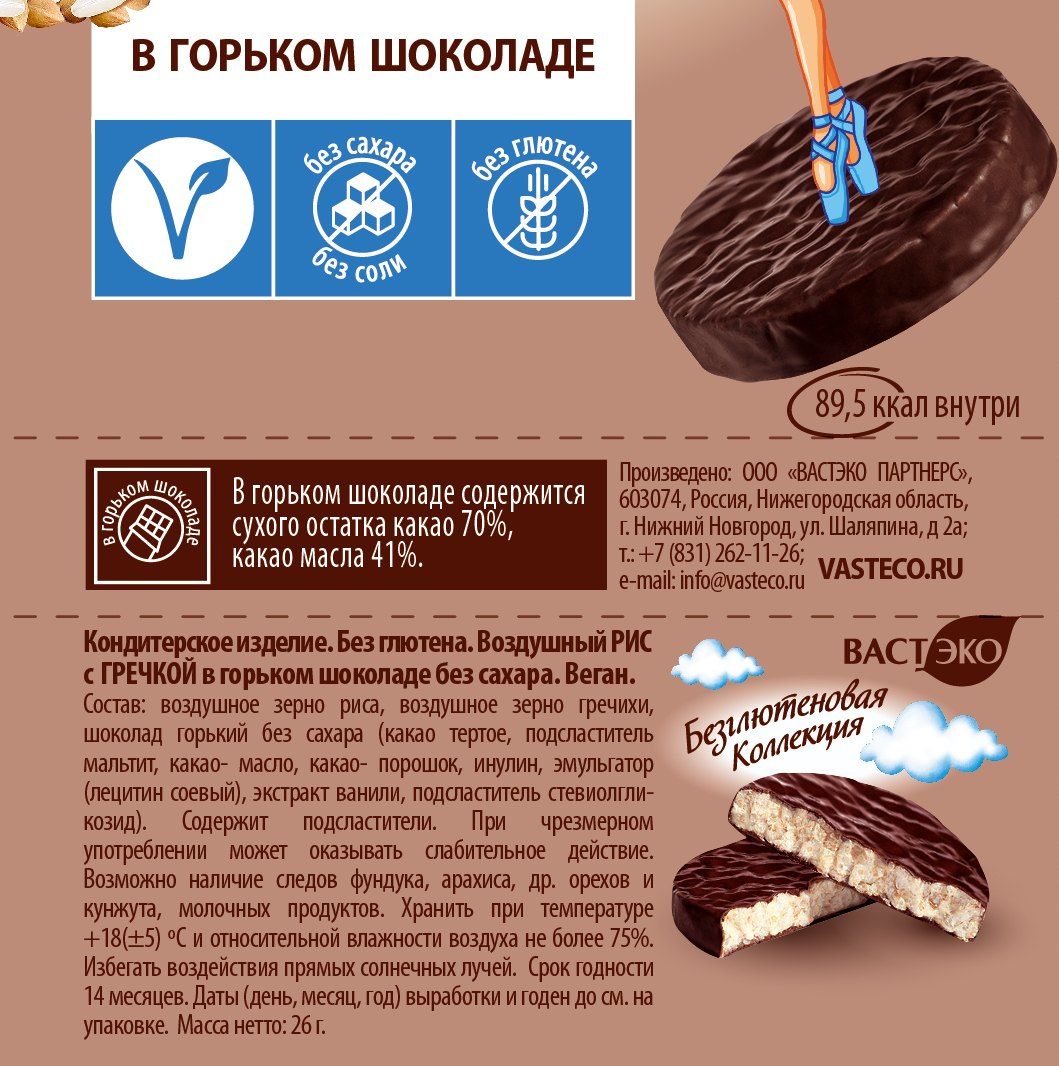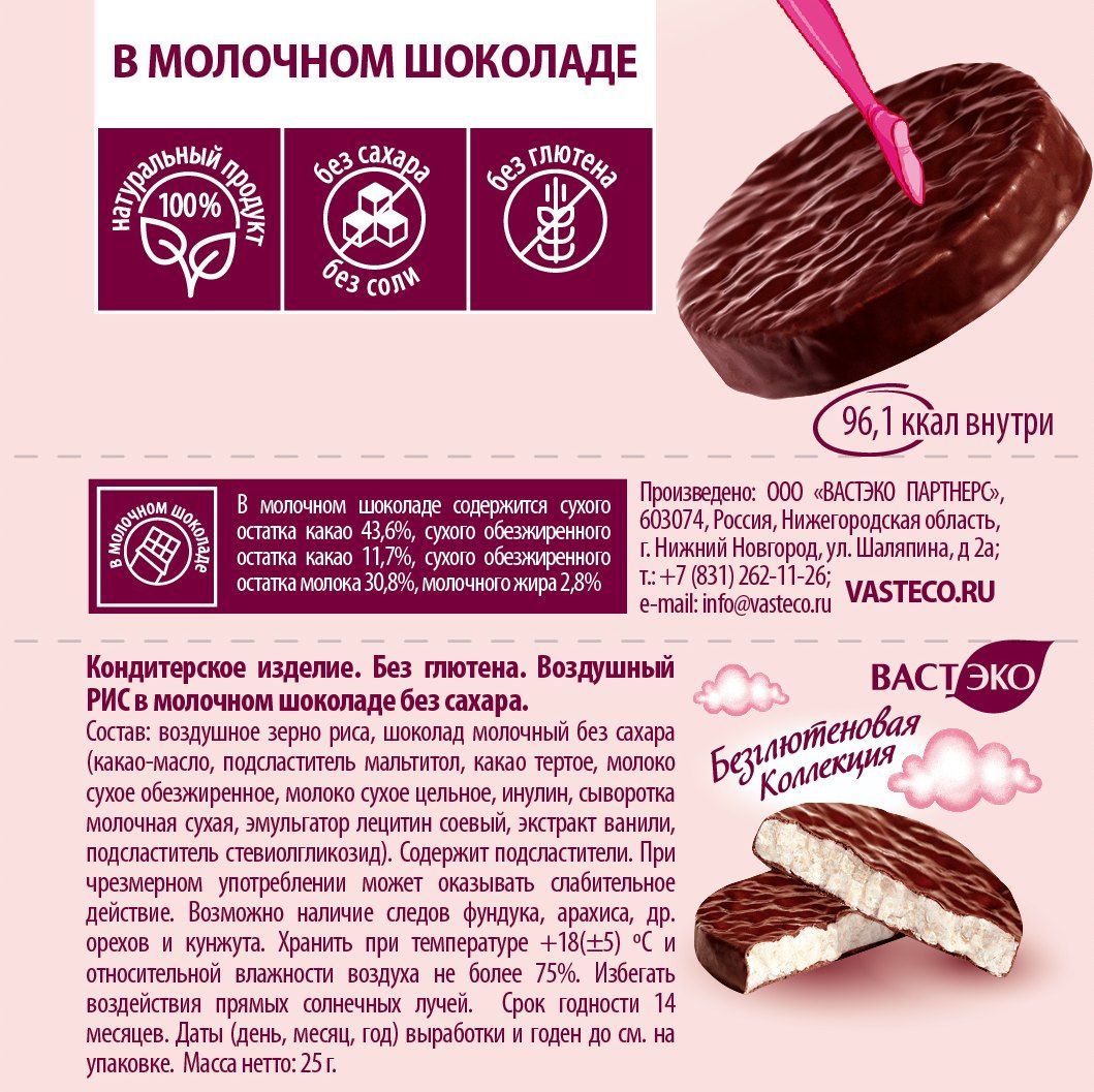 Не содержит глютен, сахар, фруктозу, пальмовое масло, ГМО маргарин, яйца или гидрогенизированные жиры,